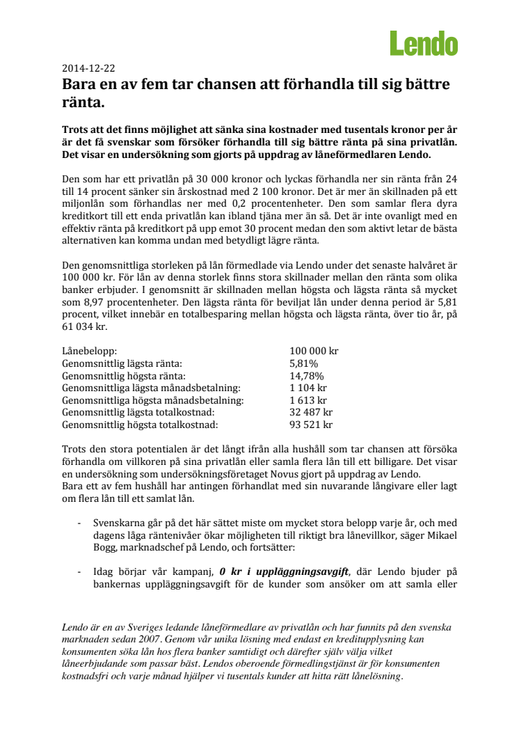 Den genomsnittliga storleken på lån förmedlade via Lendo under det senaste halvåret är 100 000 kr. För lån av denna storlek finns stora skillnader mellan den ränta som olika banker erbjuder. I genomsnitt är skillnaden mellan högsta och lägsta ränta så mycket som 8,97 procentenheter. Den lägsta ränta för beviljat lån under denna period är 5,81 procent, vilket innebär en totalbesparing mellan högsta och lägsta ränta, över tio år, på 61 034 kr.