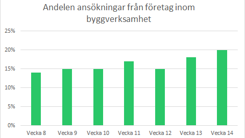 Lånejämförelsetjänsten Lendo har uppdaterat sin kartläggning över vilka branscher som vecka för vecka ansöker om finansiering. Vecka 13 var andelen ansökningar från hotell- och restaurangbranschen ovanligt hög, vecka 14 ökar andelen från företag inom byggverksamhet från 14 % vecka 8 till 20 % vecka 14.