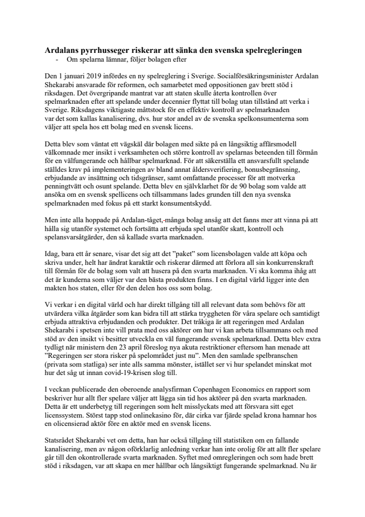 Ardalans pyrrhusseger riskerar att sänka den svenska spelregleringen - Öppet brev till Socialförsäkringsministern
