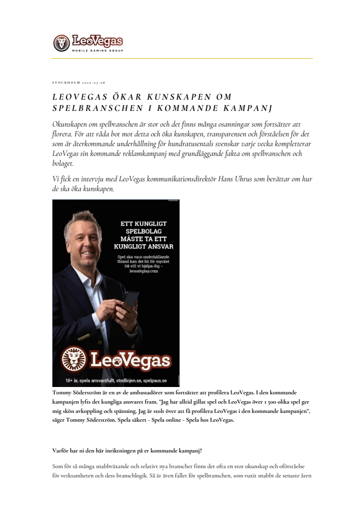 LEOVEGAS ÖKAR KUNSKAPEN OM SPELBRANSCHEN I KOMMANDE KAMPANJ