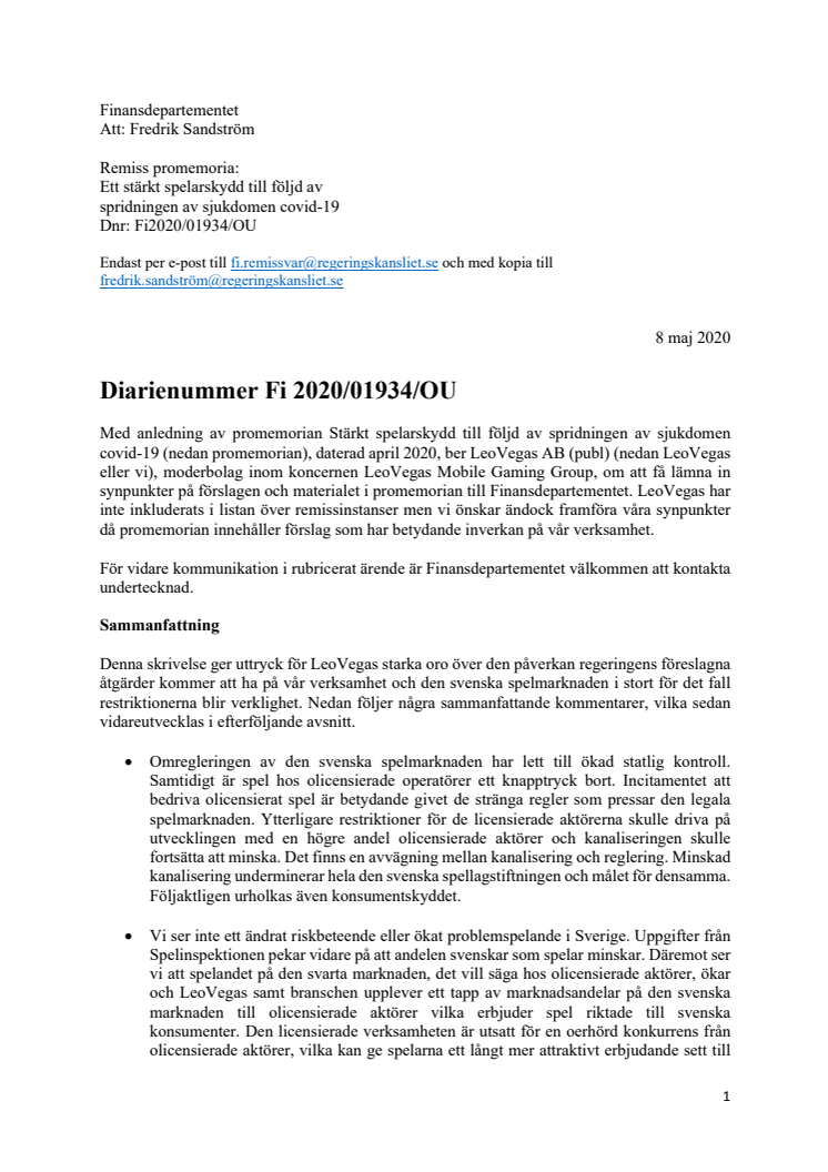 LeoVegas remiss promemoria: Ett stärkt spelarskydd till följd av spridningen av sjukdomen covid-19. Dnr: Fi2020/01934/OU. Inlämnat 2020-05-08