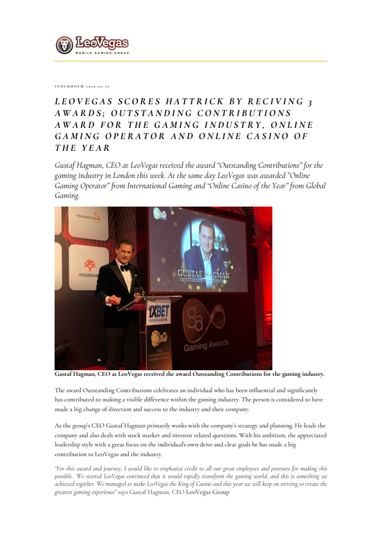 Gustaf Hagman, CEO at LeoVegas received the award “Outstanding Contributions” for the gaming industry in London this week. At the same day LeoVegas was awarded ”Online Gaming Operator” from International Gaming and “Online Casino of the Year” from Global Gaming.