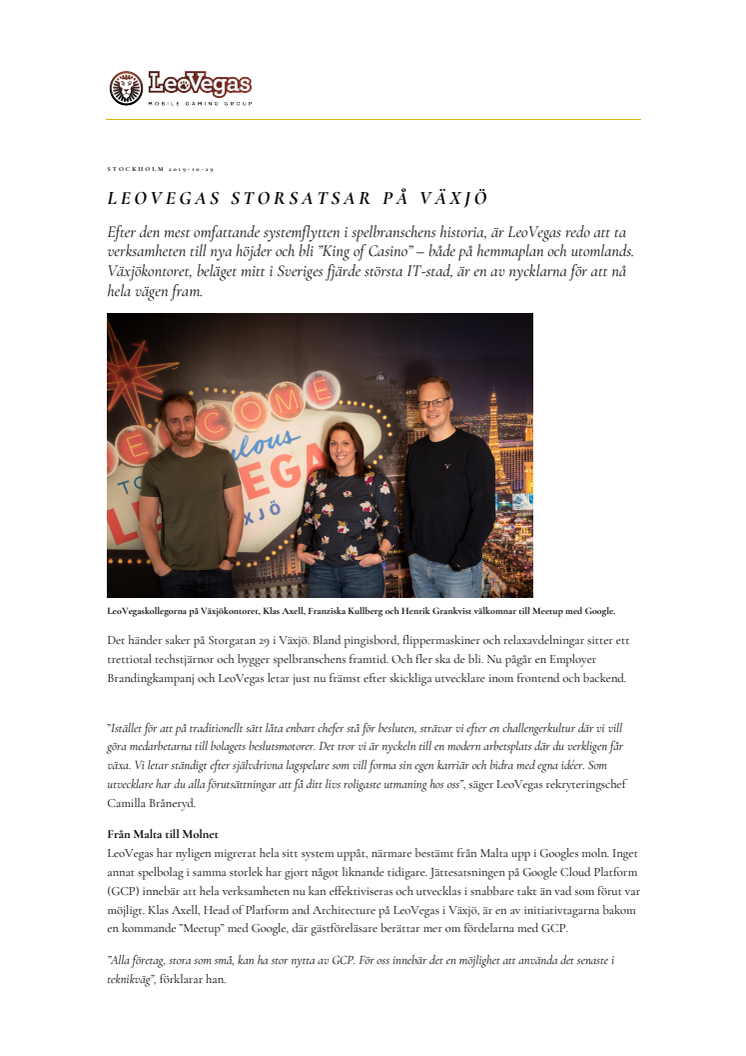 Efter den mest omfattande systemflytten i spelbranschens historia, är LeoVegas redo att ta verksamheten till nya höjder och bli ”King of Casino” – både på hemmaplan och utomlands. Växjökontoret, beläget mitt i Sveriges fjärde största IT-stad, är en av nycklarna för att nå hela vägen fram.