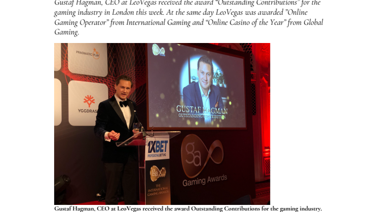 Gustaf Hagman, CEO at LeoVegas received the award “Outstanding Contributions” for the gaming industry in London this week. At the same day LeoVegas was awarded ”Online Gaming Operator” from International Gaming and “Online Casino of the Year” from Global Gaming.
