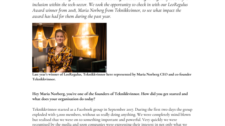 It’s been almost a year since Teknikkvinnor won the LeoRegulus Award, where you received SEK 100,000 for your fantastic and very important work with increasing gender equality & inclusion within the tech-sector. How has winning LeoRegulus Award impacted Teknikkvinnors work? What has the prize money been used for?