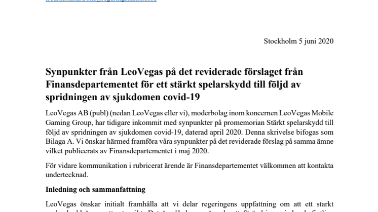 • Synpunkter från LeoVegas på det reviderade förslaget från Finansdepartementet för ett stärkt spelarskydd till följd av spridningen av sjukdomen covid-19. Inlämnat 2020-06-05.
