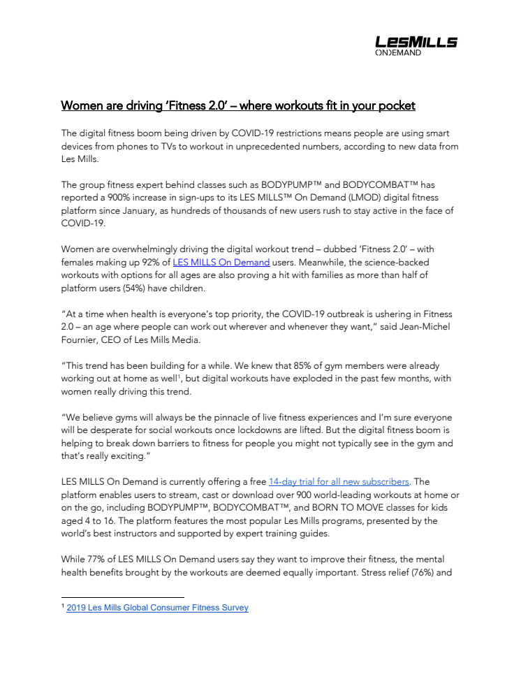 The digital fitness boom being driven by COVID-19 restrictions means people are using smart devices from phones to TVs to workout in unprecedented numbers, according to new data from Les Mills.
