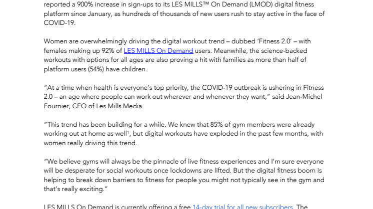 The group fitness expert behind classes such as BODYPUMP™ and BODYCOMBAT™ has reported a 900% increase in sign-ups to its LES MILLS™ On Demand (LMOD) digital fitness platform since January, as hundreds of thousands of new users rush to stay active in the face of COVID-19.