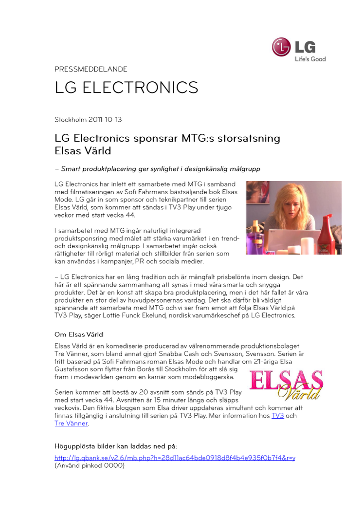 LG Electronics har inlett ett samarbete med MTG i samband med filmatiseringen av Sofi Fahrmans bästsäljande bok Elsas Mode. LG går in som sponsor och teknikpartner till serien Elsas Värld, som kommer att sändas i TV3 Play under tjugo veckor med start vecka 44.