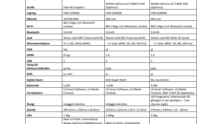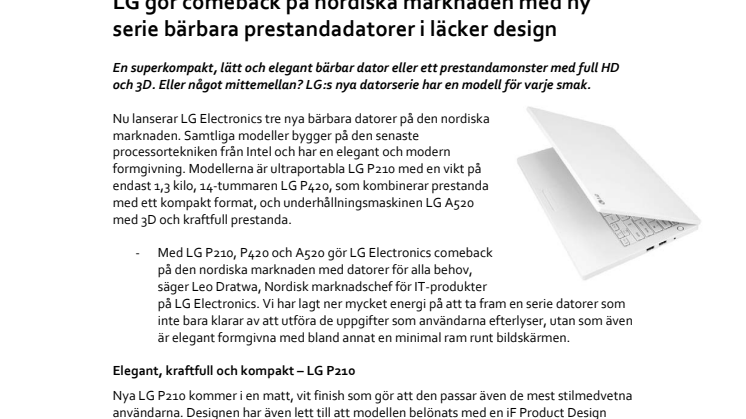 Nu lanserar LG Electronics tre nya bärbara datorer på den nordiska marknaden. Samtliga modeller bygger på den senaste processortekniken från Intel och har en elegant och modern formgivning. Modellerna är ultraportabla LG P210 med en vikt på endast 1,3 kilo, 14-tummaren LG P420, som kombinerar prestanda med ett kompakt format, och underhållningsmaskinen LG A520 med 3D och kraftfull prestanda.