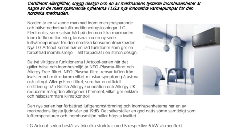 Norden är en växande marknad inom energibesparande och hälsomedvetna luftkonditioneringslösningar. LG Electronics, som satsar hårt på den nordiska marknaden inom luftkonditionering, lanserar nu en ny serie luftvärmepumpar för den nordiska konsumentmarknaden. Nya LG Artcool-serien har en rad funktioner som ger en förbättrad inomhusmiljö – allt förpackat i en stilren design.