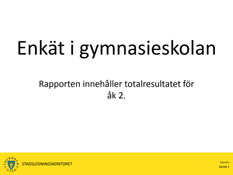 Varje år genomförs en totalundersökning i grundskolans årskurser 2, 5 och 8 samt i årskurs 2 på gymnasiet på Stockholms skolor. De senaste resultaten visar bland annat att eleverna i kommunala gymnasieskolor är mer nöjda än elever i fristående. Resultaten för gymnasieskolan har förbättrats för i stort sett alla frågeområden.
