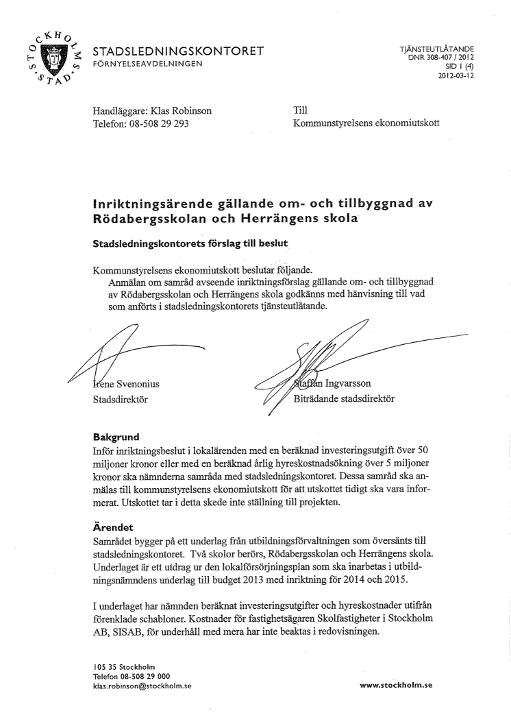 Utbildningsnämnden väntas inom kort att fatta beslut om 360 nya platser på Rödabergsskolan och 70 nya platser på Herrängens skola som ska vara klart sommaren 2016 respektive sommaren 2015. Totalt gäller det 930 nya platser för alla tre skolor.