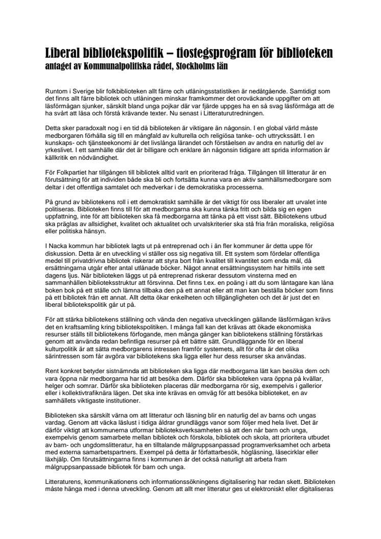 Folkpartiet kulturpolitiska nätverk presenterar idag tiopunktsprogrammet Liberal bibliotekspolitik. Programmet är antaget av Kommunalpolitiska rådet, Stockholms län. Bland kraven märks förbättrade öppettider, tillgång till trådlös uppkoppling och nej till privata bibliotek.