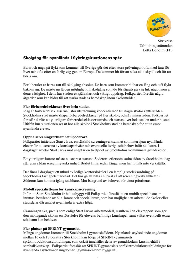 Skrivelse FP Skolgång för nyanlända i flyktingsituationens spår