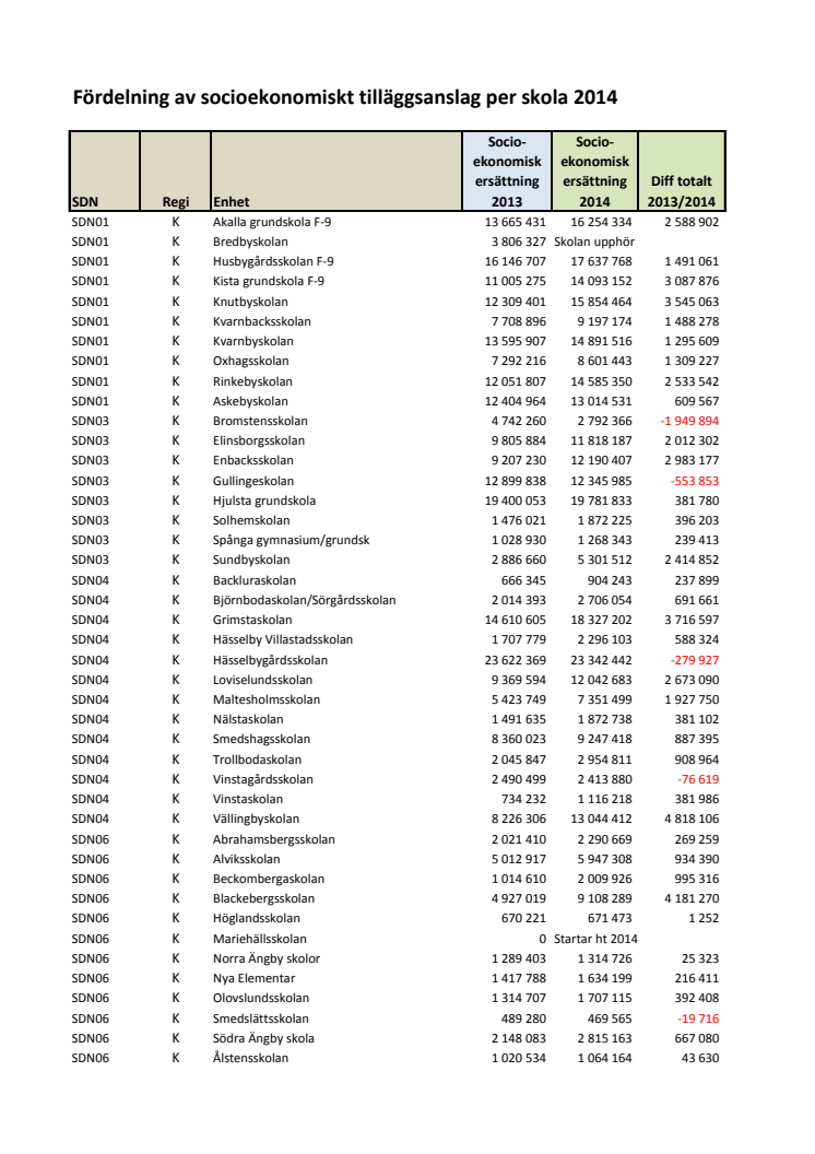 Skolbudgeten ökar under 2014 med nästan 800 miljoner och schablonerna höjs med fyra procent i genomsnitt. I lågstadiet ökas schablonen med drygt 5 procent. Det socioekonomiska stödet till de kommunala skolorna höjs med över 21 procent. Det betyder att i stort sett samtliga skolor kommer att få mer i socioekonomiskt stöd under 2014 än tidigare.