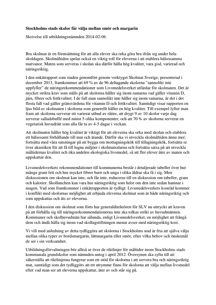 – Utbildningsförvaltningen har nu fått i uppdrag att tydliggöra för skolorna att de är fria att välja mellan smör och margarin efter vad man ser att eleverna uppskattar, äter av och står sig på. Det innebär att Stockholms stad delvis frångår Livsmedelsverkets råd om bra mat i skolan – där lättmargarin och lättmjölk rekommenderas, säger Lotta Edholm (FP), skolborgarråd.