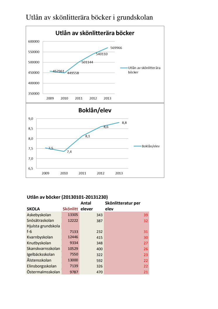 Utlåningen har ökat med 24 procent sedan 2009. Antalet lånade böcker per elev har ökat från 7,5 till 8,8. Mer information i den bifogade filen.