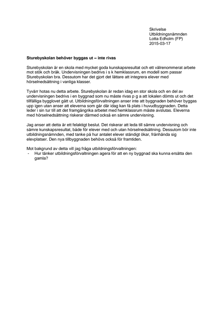 - Sturebyskolan är en mycket välfungerande skola som bland annat arbetar på ett fantastiskt sätt med sina elever med hörselnedsättning. Det goda arbetet ska inte behöva stryka på foten på grund av att den politiska ledningen inte förmår komma till beslut, säger Lotta Edholm (FP), oppositionsborgarråd och gruppledare.