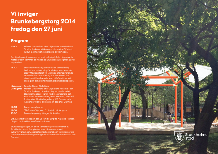 Fredagen den 27 juni kl 11.00 inviger kultur- och fastighetsborgarrådet Madeleine Sjöstedt (FP) det konst- och evenemangsprojekt som under juli-september 2014 förvandlar Brunkebergstorg från ett arkitektoniskt tomrum till en stadspark, vars hörnstenar är installationskonst, mat, musik och evenemang.