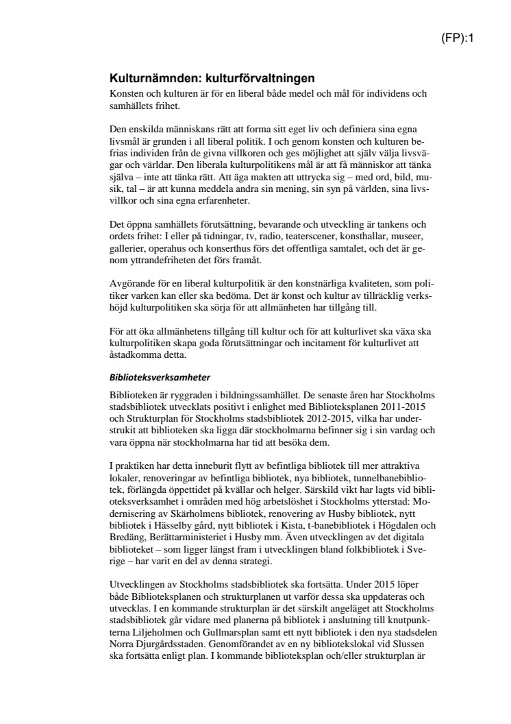 Folkpartiet satsar på kulturen i sitt förslag till budget för Stockholms stad 2015, mer än majoritetens budgetförslag. Bland annat utökas El Sistema och 9 miljoner avsätts för att bygga bibliotek i Gullmarsplan, Liljeholmen och Norra Djurgårdsstaden.