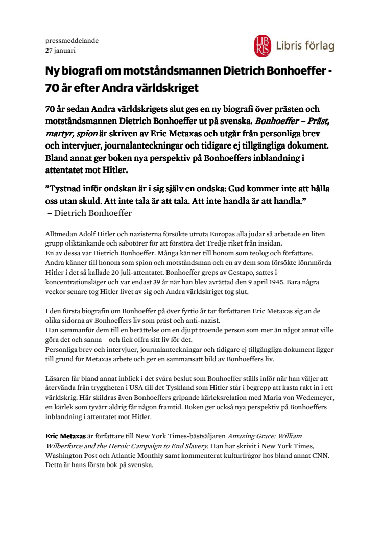 70 år sedan Andra världskrigets slut ges en ny biografi över prästen och motståndsmannen Dietrich Bonhoeffer ut på svenska. Bonhoeffer – Präst, martyr, spion är skriven av Eric Metaxas och utgår från personliga brev och intervjuer, journalanteckningar och tidigare ej tillgängliga dokument.Bland annat ger boken nya perspektiv på Bonhoeffers inblandning i attentatet mot Hitler.