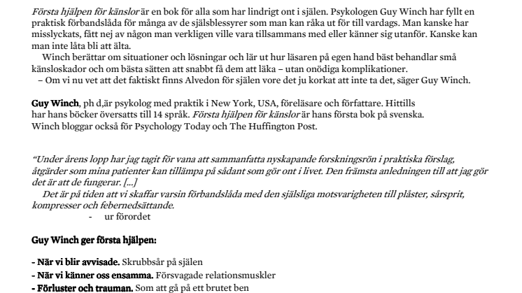 Guy Winch, ph d,är psykolog med praktik i New York, USA, föreläsare och författare. Hittills har hans böcker översatts till 14 språk. Första hjälpen för känslor är hans första bok på svenska. Winch bloggar också för Psychology Today och The Huffington Post.