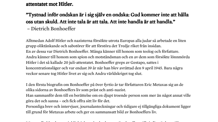 70 år sedan Andra världskrigets slut ges en ny biografi över prästen och motståndsmannen Dietrich Bonhoeffer ut på svenska. Bonhoeffer – Präst, martyr, spion är skriven av Eric Metaxas och utgår från personliga brev och intervjuer, journalanteckningar och tidigare ej tillgängliga dokument.Bland annat ger boken nya perspektiv på Bonhoeffers inblandning i attentatet mot Hitler.