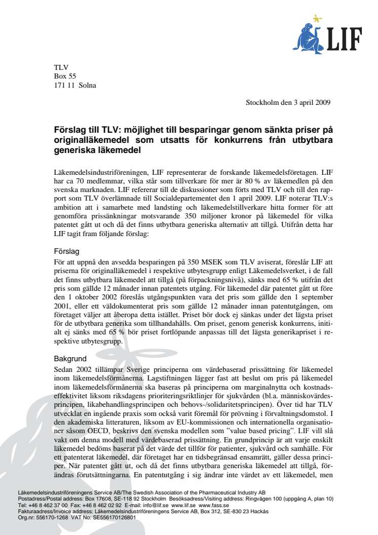 • LIF föreslår modell att spara 350 Mkr på originalläkemedel där patentet gått ut