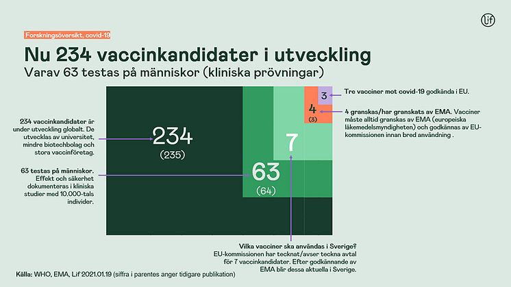 Det finns idag över 200 vaccinkandidater under utveckling globalt, varav ett 50-tal kandidater befinner sig i kliniska studier, alltså testas på människor. Förutom de tre godkända vaccinerna är ytterligare en kandidat under granskning av den europeiska läkemedelsmyndigheten EMA, vilket krävs innan de kan bli godkända för användning inom EU.