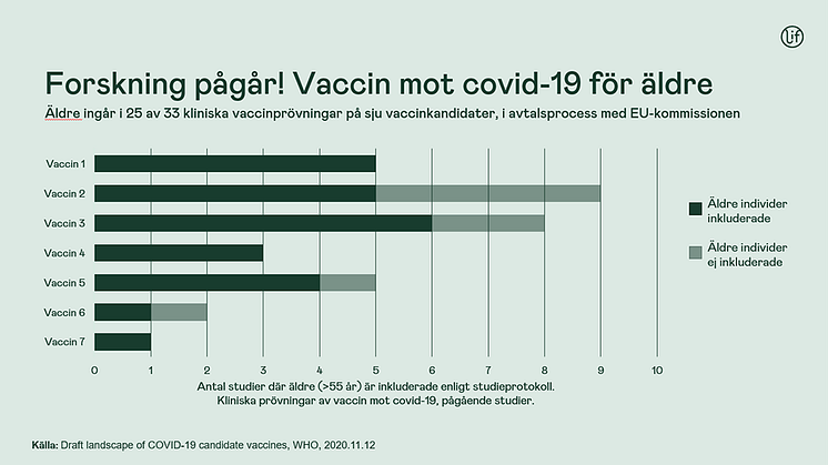 Äldre är en av riskgrupperna för att drabbas av svår covid-19-sjukdom. Därmed är det viktigt att de vacciner som utvecklas har god effekt på den gruppen. Det har funnits enstaka uppgifter om att äldre inte ingår i de kliniska vaccinprövningarna som pågår mot covid-19. Det stämmer inte. Statistik som Lif nu publicerar visar att samtliga sju vaccinkandidater i avtalsprocess med EU-kommission, och som därmed kan bli aktuella i Sverige, har äldre med i studierna.