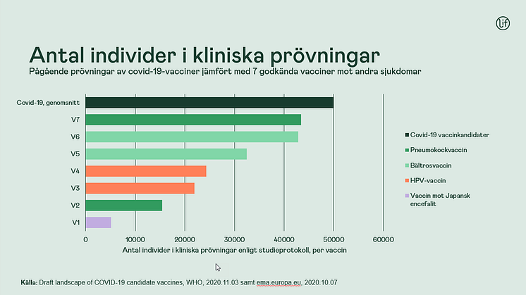 Lif har tagit fram ”Utveckling av vaccin mot covid-19 i siffor”, en forskningsöversikt över covid-19-vacciner som visar hur många kandidater som befinner under utveckling och hur många som inlett kliniska studier. Lifs statistik åskådliggör också antalet personer som deltar i kliniska studier för de vaccinkandidater som EU har inlett förhandlingar med. I översikten ingår också data som jämför ett urval av pågående prövningar av covid-19-vacciner med godkända vacciner mot andra sjukdomar.