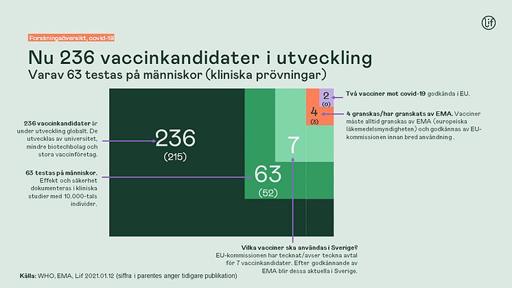 Forskningen på vacciner mot covid-19 fortsätter att öka i omfattning. Nu finns 236 vaccinkandidater under utveckling globalt, varav 63 har börjat testas på människor i kliniska prövningar.