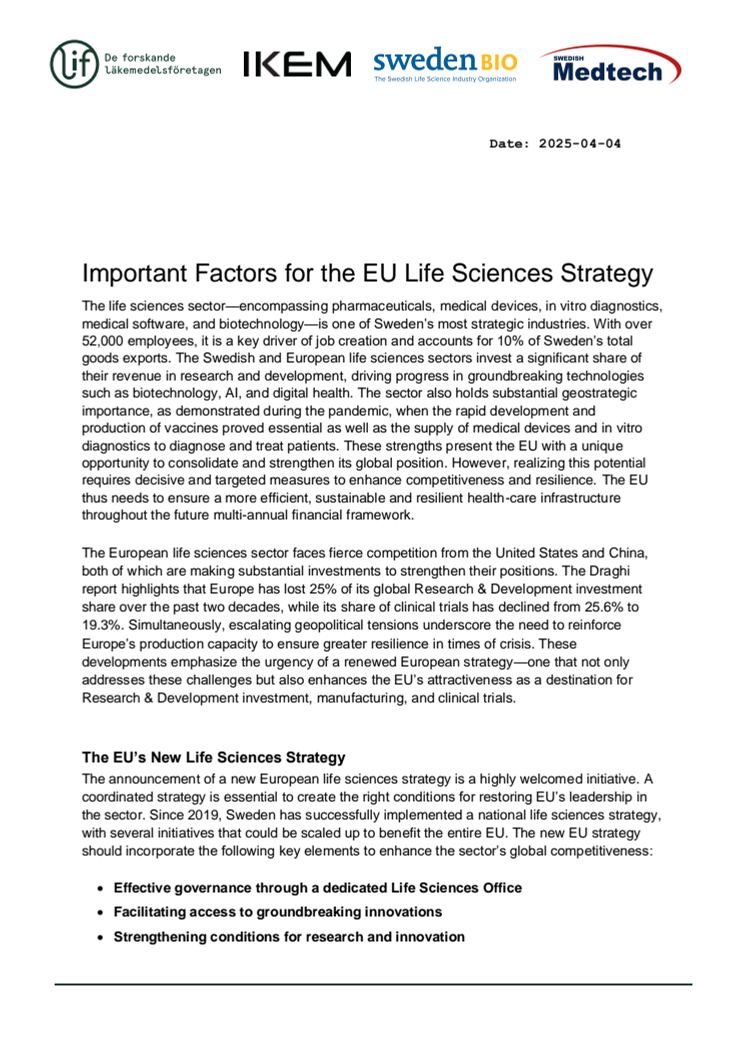 Inför att EU-kommissionen presenterar en ny strategi för life science har fyra ledande branschorganisationer i Sverige: Lif – de forskande läkemedelsföretagen, SwedenBIO, IKEM och Swedish Medtech lämnat ett gemensamt inspel. Organisationerna efterlyser en kraftfull europeisk strategi för att stärka konkurrenskraften, säkra innovationen och rusta Europas försörjningsberedskap inom läkemedel och medicinteknik.