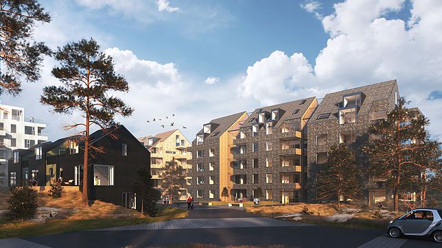 Uggleberget i Nya Hovås/Brottkärr söder om Göteborg, 250 nya bostäder. Juryn har valt att gå vidare med två av de fem förslagen så denna vinst delar vi med Fojab. Beställare: Familjebostäder i Göteborg.