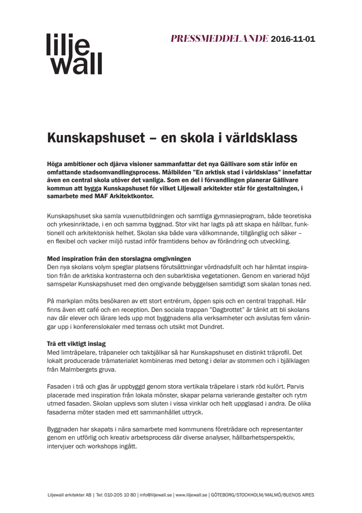 Höga ambitioner och djärva visioner sammanfattar det nya Gällivare som står inför en omfattande stadsomvandlingsprocess. Målbilden "En arktisk stad i världsklass" innefattar även en central skola utöver det vanliga. Som en del i förvandlingen planerar Gällivare kommun att bygga Kunskapshuset för vilket Liljewall arkitekter står för gestaltningen, i samarbete med MAF Arkitektkontor.