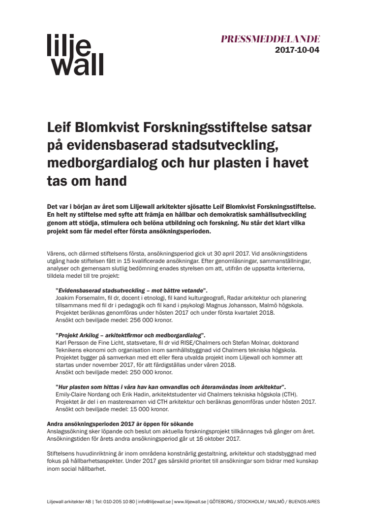 Med viljan att främja en hållbar och demokratisk samhällsutveckling instiftade Liljewall arkitekter Leif Blomkvist Forskningsstiftelse i början av 2017.
