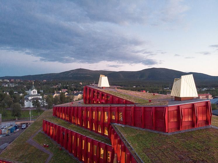 Under projektets gång kontaktade vi därför tre samiska konstnärer, målaren Anders Sunna, glaskonstnären Monica Edmondsson och textilkonstnären Britta Marakatt-Labba. De fick i uppdrag att skapa unika konstverk för att knyta an byggnaden till ursprungskulturen, säger Lars Olausson, gestaltningsansvarig arkitekt på Liljewall.