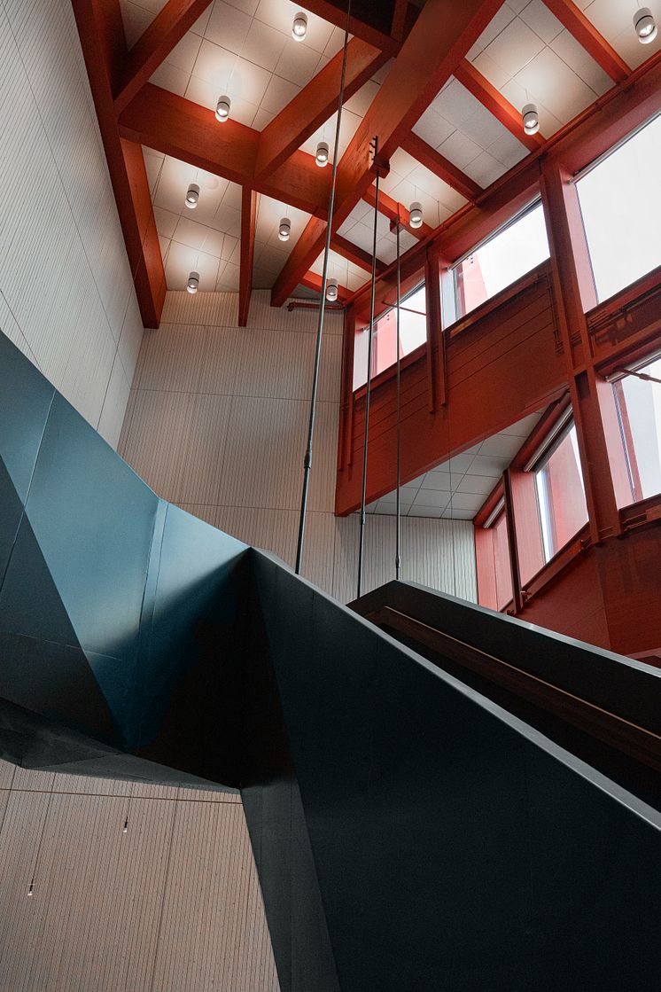 Den sex våningar höga, asymmetriska byggnaden har en distinkt träprofil med iögonfallande exteriöra och interiöra träinslag som utmärker den. Det är en flexibel och vacker utbildningsmiljö rustad för framtidens behov av förändring och utveckling.
