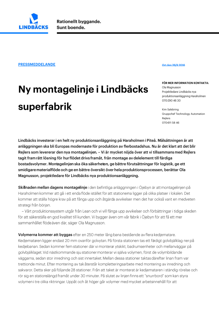 Lindbäcks investerar i en helt ny produktionsanläggning på Haraholmen i Piteå. Målsättningen är att anläggningen ska bli Europas modernaste för produktion av flerbostadshus. Nu är det klart att det blir Rejlers som levererar den nya montagelinjen.