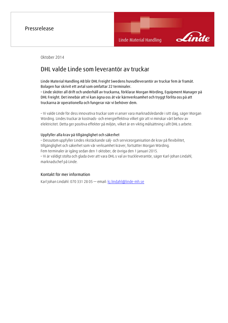 Linde Material Handling AB blir DHL Freight Swedens huvudleverantör av truckar fem år framåt. Bolagen har skrivit ett avtal som omfattar 22 terminaler.