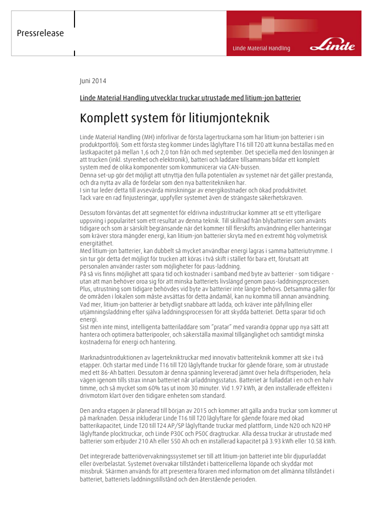 Linde Material Handling (MH) införlivar de första lagertruckarna som har litium-jon batterier i sin produktportfölj. Som ett första steg kommer Lindes låglyftare T16 till T20 med en lastkapacitet på mellan 1,6 och 2,0 ton att kunna beställas från och med september.