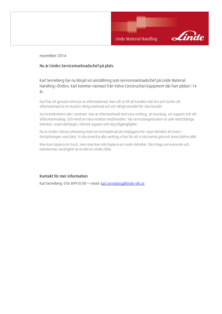 Karl Serneberg har nu börjat sin anställning som servicemarknadschef på Linde Material Handling i Örebro. Karl kommer närmast från Volvo Construction Equipment där han jobbat i 14 år.