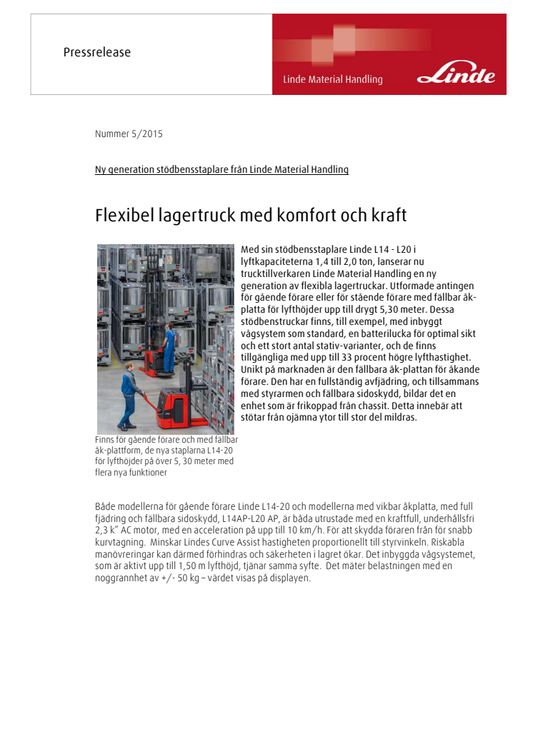 Med sin stödbensstaplare Linde L14 - L20 i lyftkapaciteterna 1,4 till 2,0 ton, lanserar nu trucktillverkaren Linde Material Handling en ny generation av flexibla lagertruckar. Utformade antingen för gående förare eller för stående förare med fällbar åk-platta för lyfthöjder upp till drygt 5,30 meter.