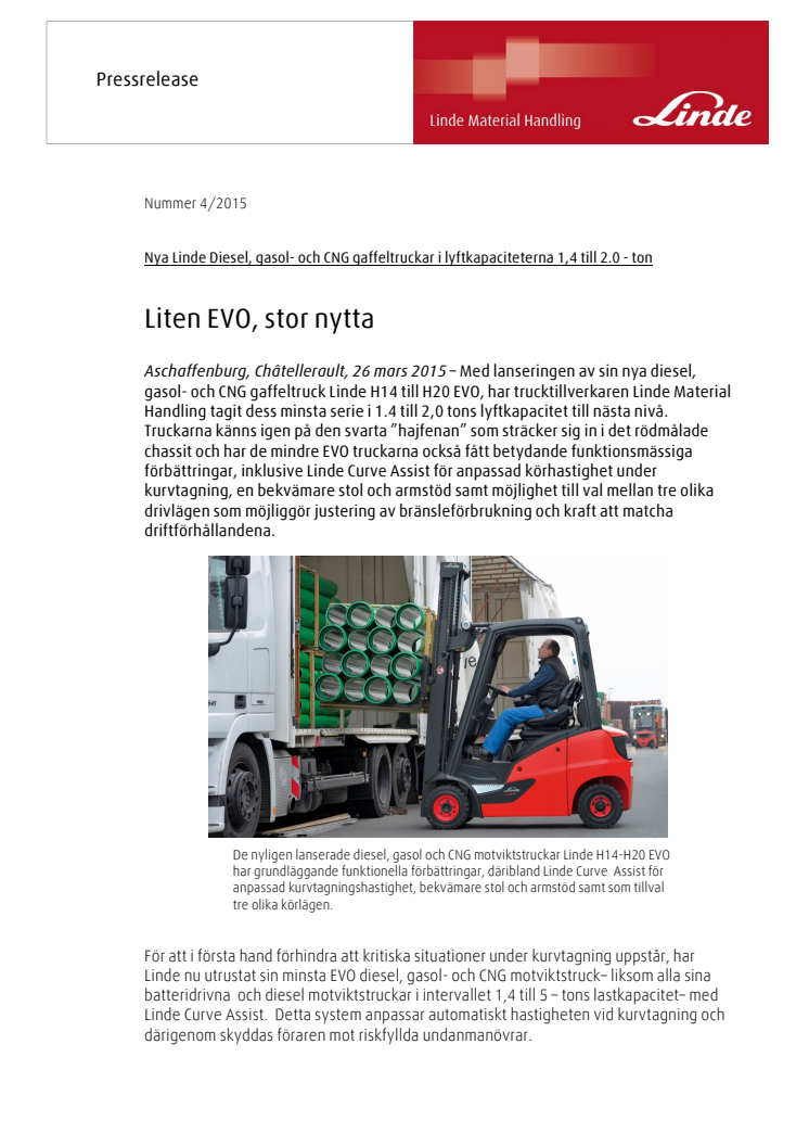 Truckarna känns igen på den svarta ”hajfenan” som sträcker sig in i det rödmålade chassit och har de mindre EVO truckarna också fått betydande funktionsmässiga förbättringar, inklusive Linde Curve Assist för anpassad körhastighet under kurvtagning, samt möjlighet till val mellan tre olika drivlägen som möjliggör justering av bränsleförbrukning och kraft att matcha driftförhållandena.