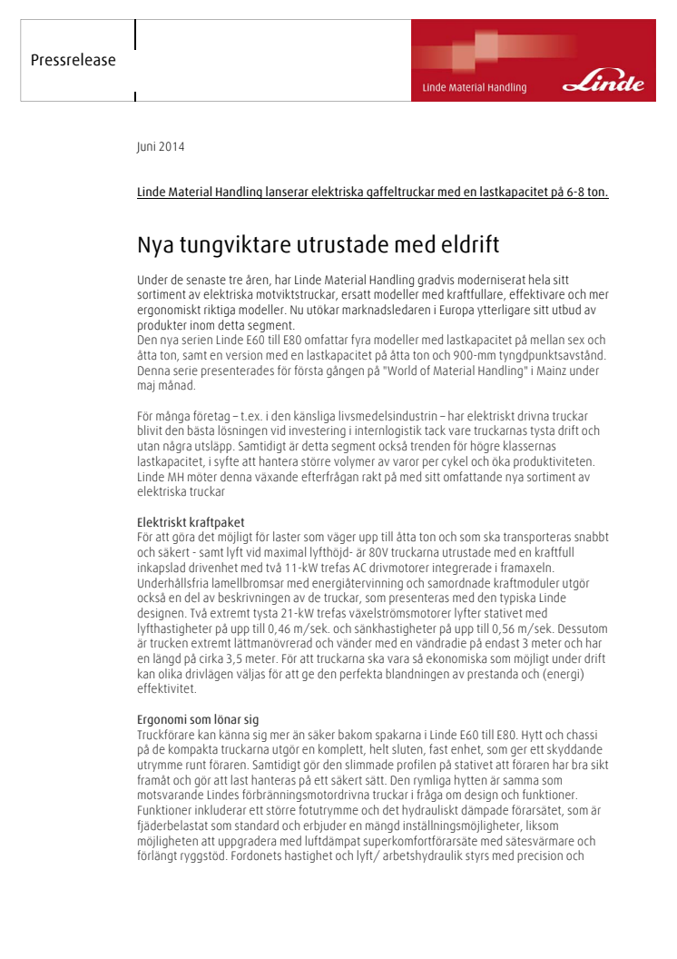 Under de senaste tre åren, har Linde Material Handling gradvis moderniserat hela sitt sortiment av elektriska motviktstruckar, ersatt modeller med kraftfullare, effektivare och mer ergonomiskt riktiga modeller. Nu utökar Linde sitt utbud ytterligare med Linde E60 till E80 med lastkapacitet på mellan sex och åtta ton, samt en version med en lastkapacitet på åtta ton och 900-mm tyngdpunktsavstånd.
