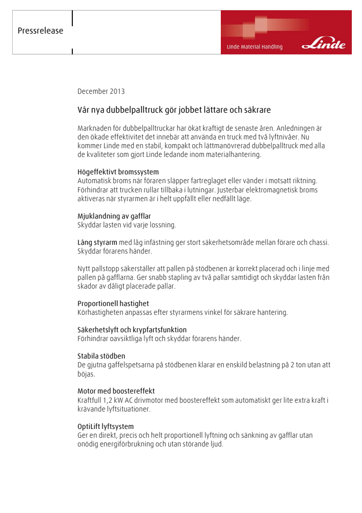 Marknaden för dubbelpalltruckar har ökat kraftigt de senaste åren. Anledningen är den ökade effektivitet det innebär att använda en truck med två lyftnivåer. Nu kommer Linde med en stabil, kompakt och lättmanövrerad dubbelpalltruck med alla de kvaliteter som gjort Linde ledande inom materialhantering