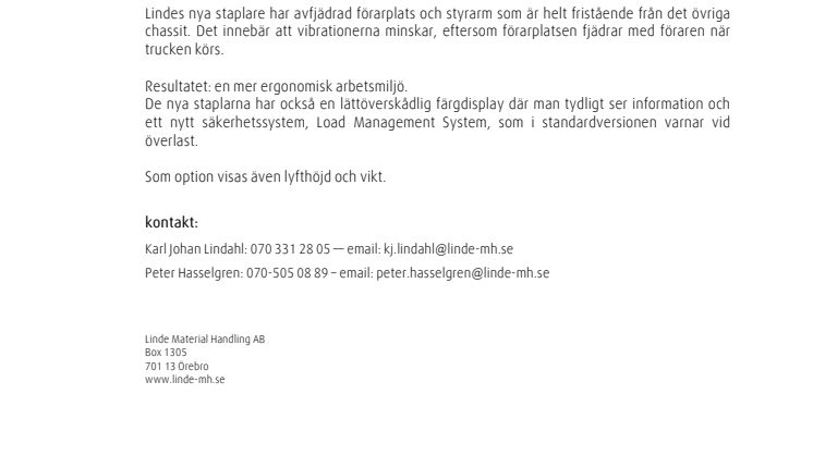 Peter Hasselgren: 070-505 08 89 – email: peter.hasselgren@linde-mh.se