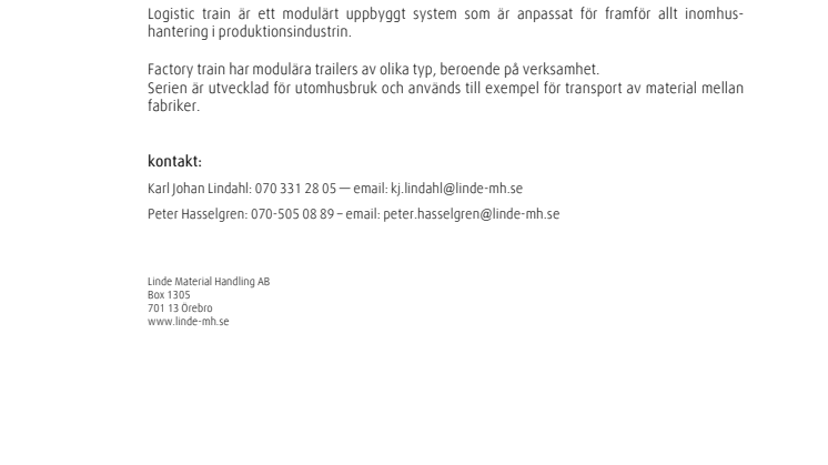 Peter Hasselgren: 070-505 08 89 – email: peter.hasselgren@linde-mh.se