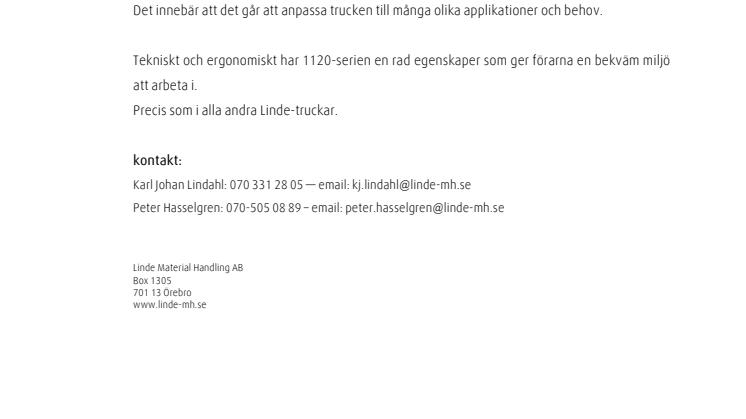 Peter Hasselgren: 070-505 08 89 – email: peter.hasselgren@linde-mh.se
